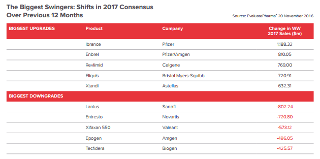 This year Sanofi’s insulin Lantus was removed from a number of formularies in favour of Lilly’s approaching biosimilar Basaglar; as a result almost a billion dollars was erased from Sanofi’s 2017 sales forecast over the course of 2016. On the flip side, Enbrel has seen substantial upgrades. This analysis was conducted before Amgen’s third-quarter warning, serving to demonstrate that many analysts are still underestimating the extent of the on-going price battle in the US.