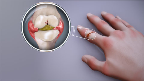 Rheumatoid arthritis usually develops when the immune system attacks the synovium, which is a lining of the membrane that surrounds the joints. As a result, there is inflammation that thickens the synovium which ultimately destroys the cartilage and bone within the joint. The tendons and ligaments that hold the joint also get stretched and weaken and the joint loses its shape and alignment. There is no specific cause for the immune system to attack the synovium but genes, environmental factors, and viral and bacterial infections have been commonly found as triggers.
